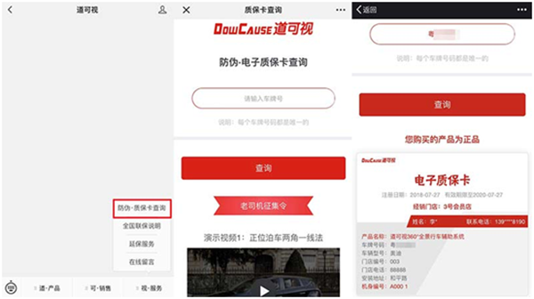汲取在產(chǎn)品銷(xiāo)售與售后服務(wù)上的經(jīng)驗(yàn)積累,道可視在售后服務(wù)上不僅擁有一套標(biāo)準(zhǔn)化的操作流程,還推出“電子質(zhì)?!と珖?guó)聯(lián)?!钡氖酆笳?。每個(gè)購(gòu)買(mǎi)過(guò)道可視產(chǎn)品的消費(fèi)者,都會(huì)獲得一張道可視“電子質(zhì)??ā?,這張電子質(zhì)保卡是道可視產(chǎn)品的真?zhèn)尾樵儜{證,也是集產(chǎn)品信息、門(mén)店信息與用戶信息于一體的售后資格憑證。