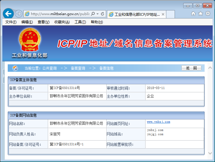 我公司更名為邯鄲市永年區(qū)明芳緊固件有限公司,同時(shí)公司網(wǎng)站在工信部的備案信息也進(jìn)行了更新并通過審核,備案號不變(冀ICP備05013314號-1)。這次更新備案信息,除了保留原有域名ynbzj.com(永年標(biāo)準(zhǔn)件之意)外,新增域名ynjgj.com(永年緊固件之意)。